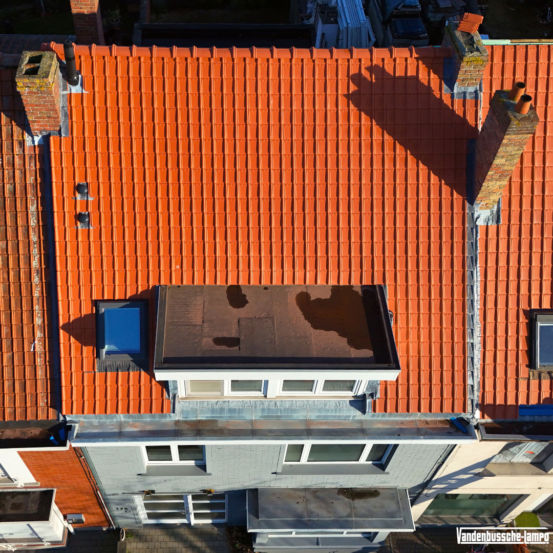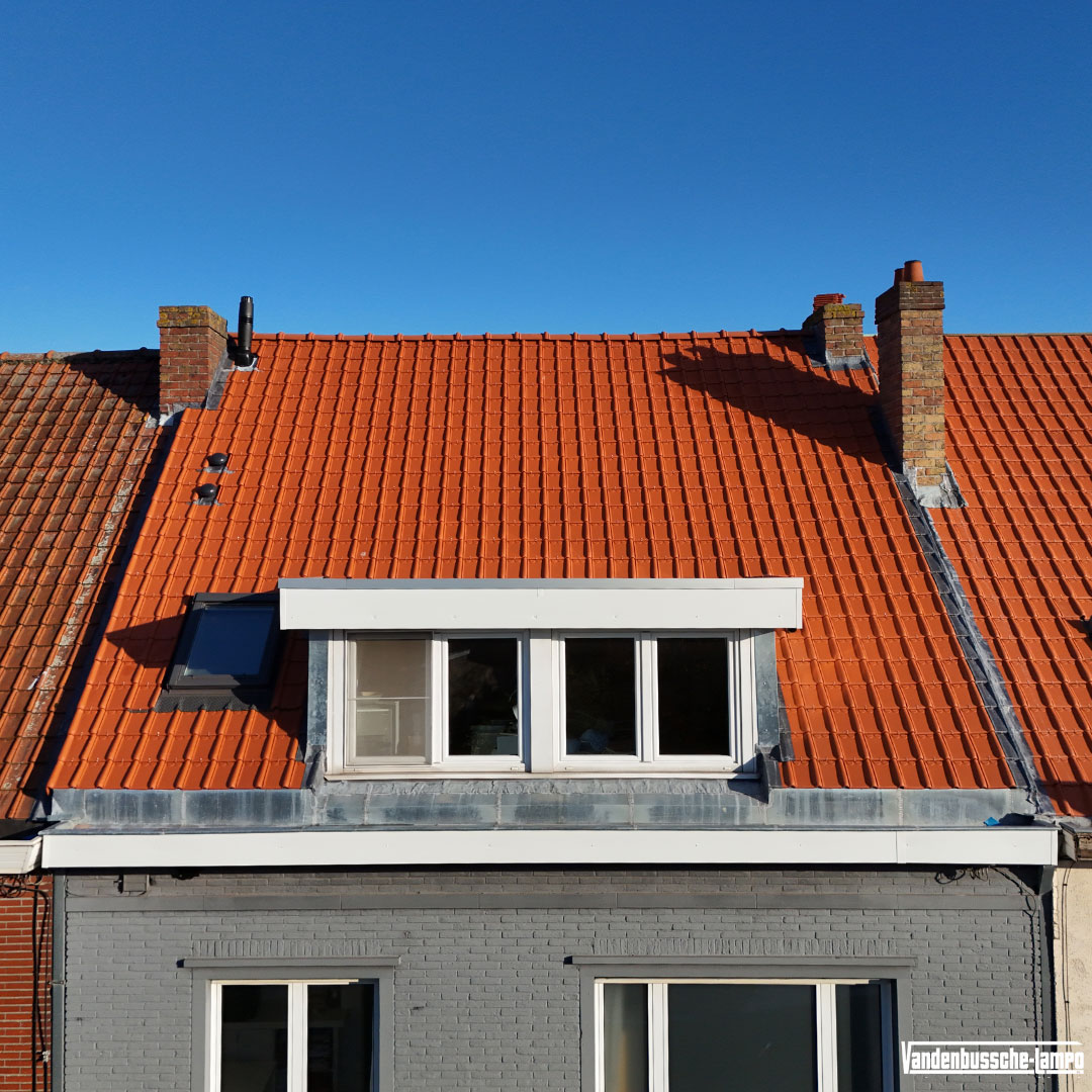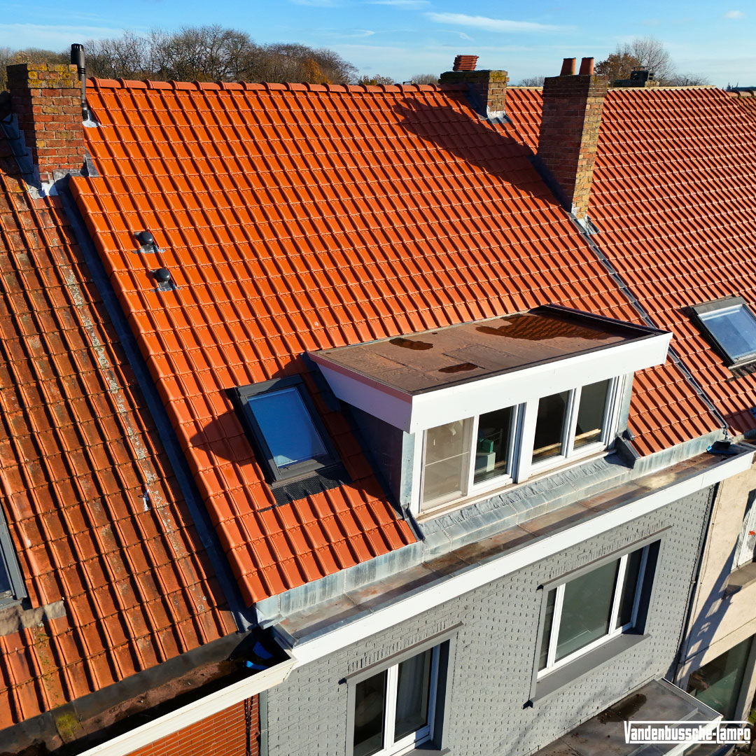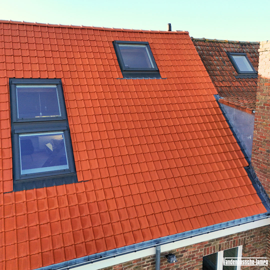 Voor de renovatie van dit hellend dak maakten we gebruik van Sarking-isolatie voor een optimale thermische bescherming. De afwerking werd uitgevoerd met Stormpan 44 in de kleur natuurrood. Deze unieke kleur ontstaat door de pannen te bakken in een zuurstofrijke omgeving, volledig zonder chemische toevoegingen, waardoor ze zowel milieuvriendelijk als veilig voor de gezondheid zijn. Stormpan 44 heeft zelfs een ecologisch keurlabel en is internationaal erkend als duurzaam bouwmateriaal. De producent draagt actief bij aan een circulaire en duurzame bouwsector, met maatregelen zoals het minimaliseren van transportlijnen en het beperken van energieverbruik tijdens productie. Daarnaast werden de bakgoten in PVC uitgevoerd, de Velux-dakramen vernieuwd, en het platform geïsoleerd en afgewerkt met EPDM Tiplon, voor een volledig waterdicht en duurzaam resultaat.